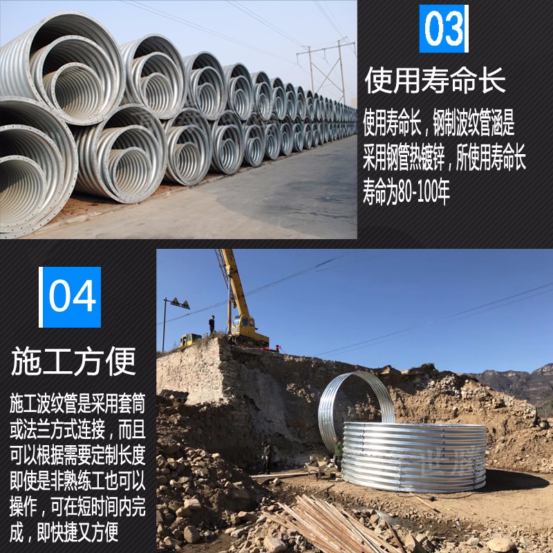 2、運(yùn)輸方便: 鋼波紋管的重量只有同口徑水泥管的1/10 到 1/5,即使在窄的場(chǎng)所沒有運(yùn)輸設(shè)備,人工也可運(yùn)輸。