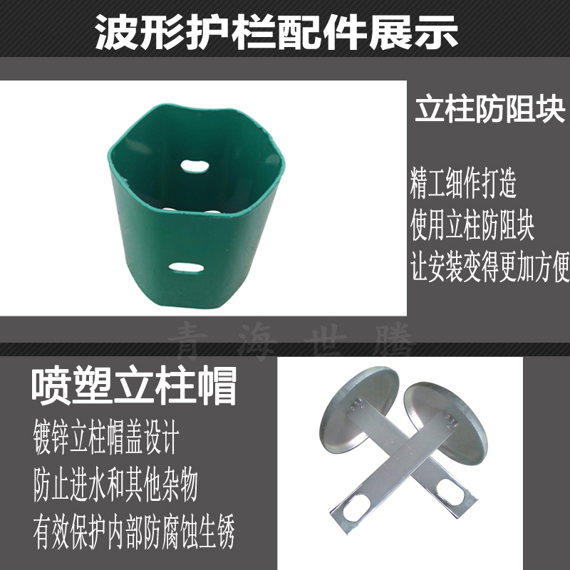 雙波波形護欄板:4320*310*85*3/4;三波波形護欄板:4320*506*85*3/4;雙波立柱:114/140 mm×4.5mm×高度;三波立柱:114/Oslash;140 mm×4.5mm×高度;一般立柱間距分為2米間距和4米間距;立柱與板子相連接的方式有防阻塊式和托架式兩種。